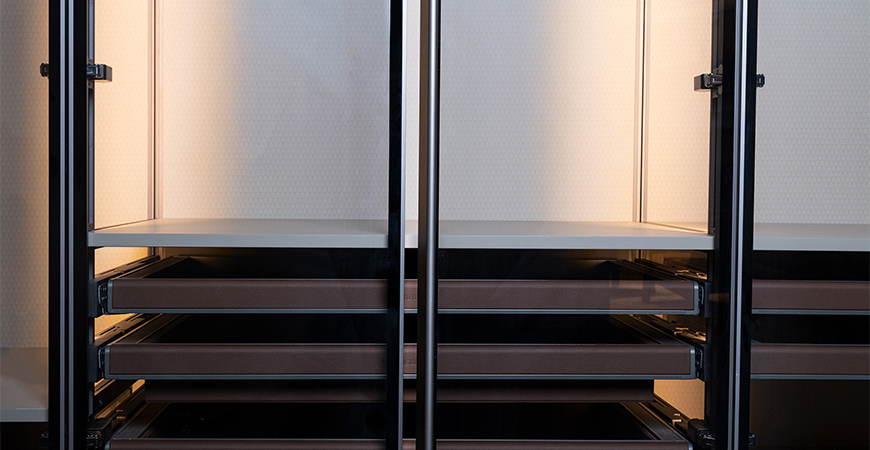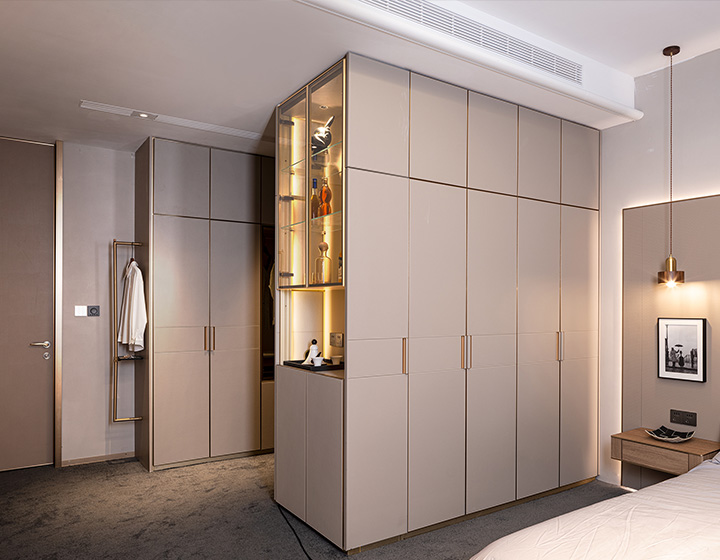 柜內(nèi)線燈位于立柱槽口向內(nèi)照射,不刺眼,且光線不會(huì)被懸掛的衣物等收納物品遮擋,方便物品的取用。